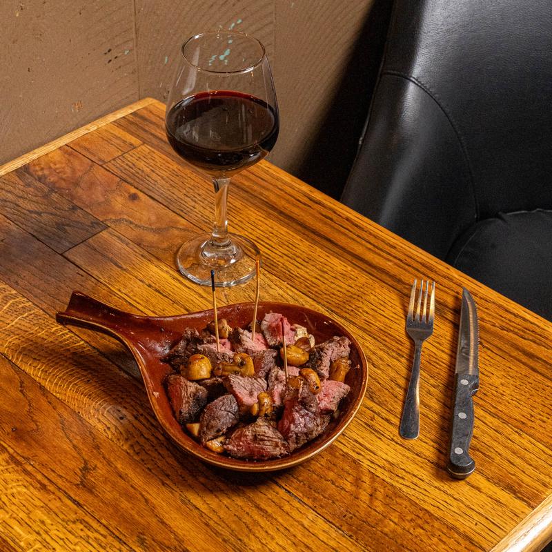 Hand-cut steak bites served with sautéed mushrooms.