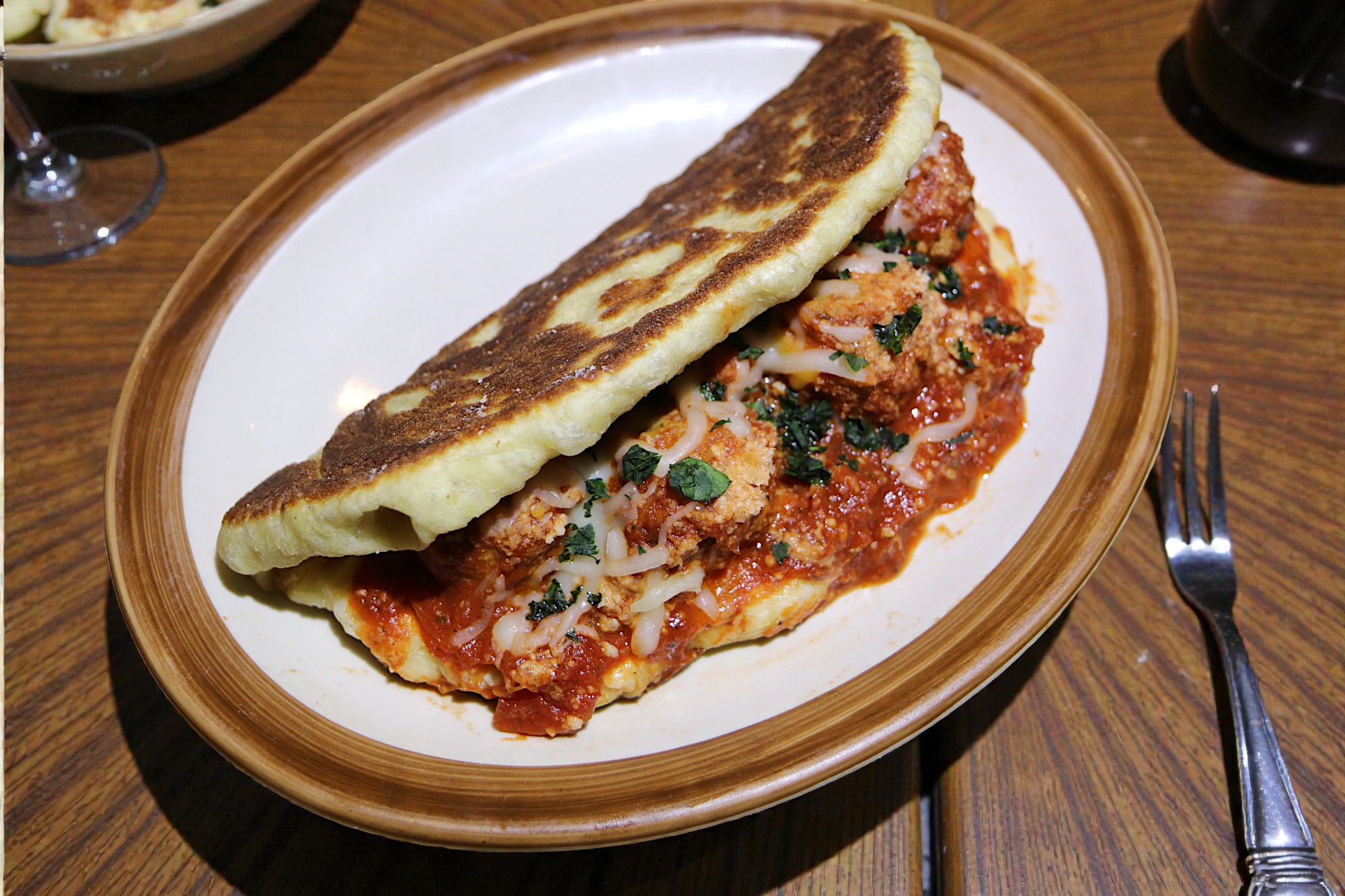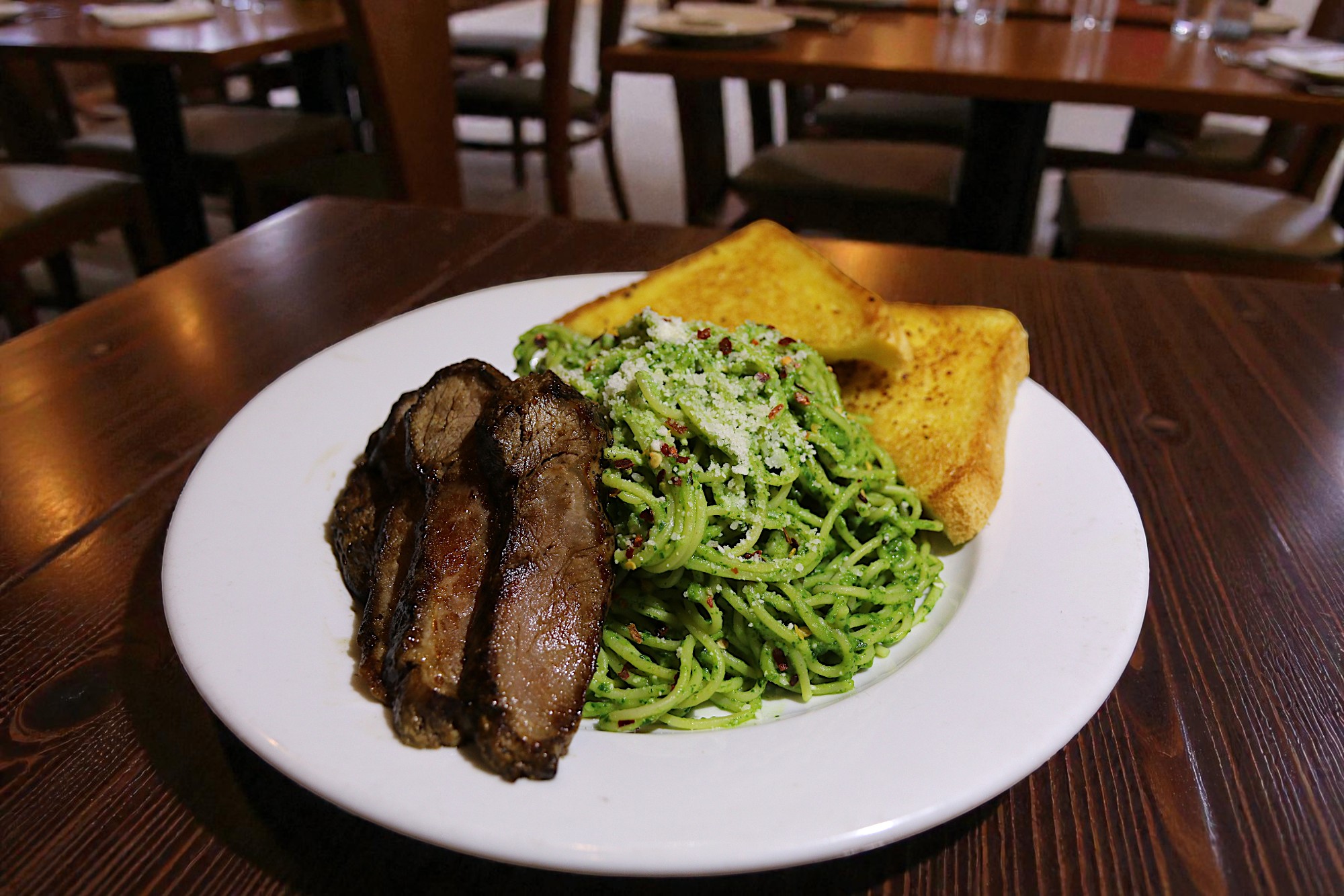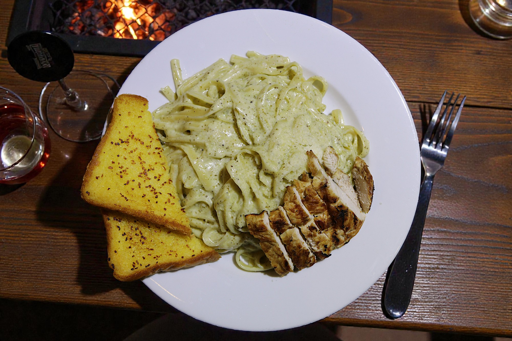Chicken breast over fettuccine, tossed in rich alfredo sauce basil pesto, finished with parmesan.