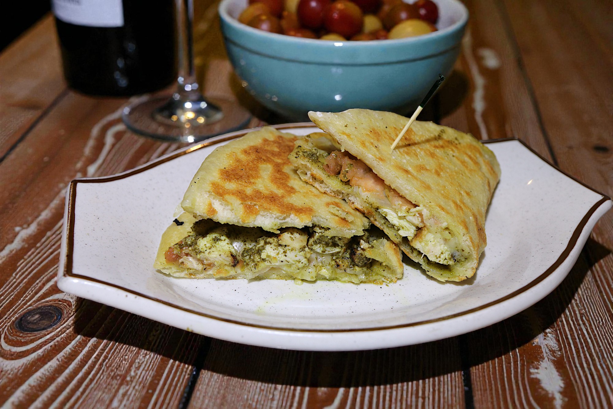 Grilled chicken, mozzarella, tomato, basil pesto, in a flat-top grilled pizza dough.