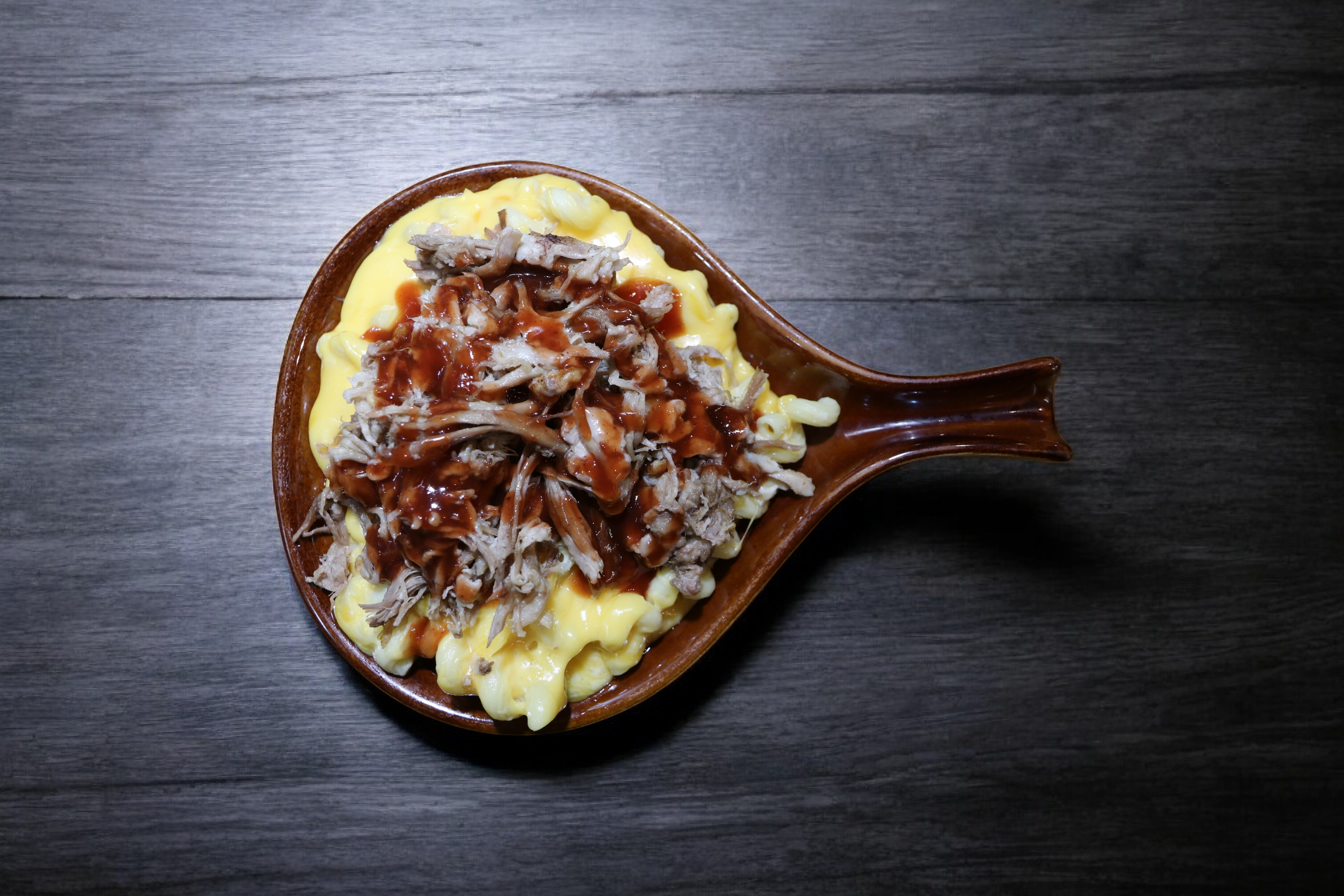 Cavatappi, yellow sharp cheddar, pulled pork & BBQ sauce
