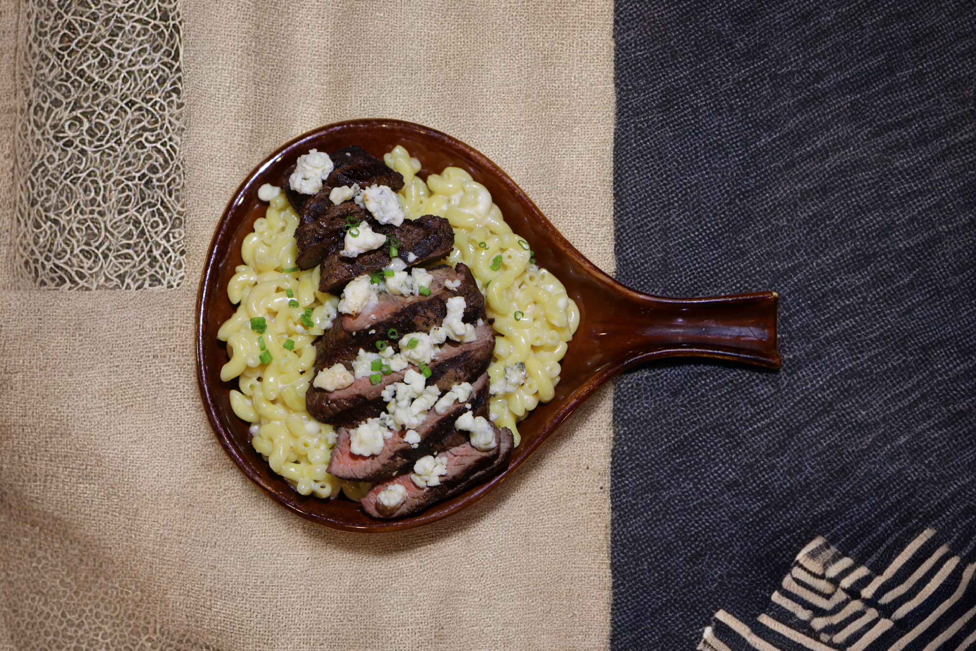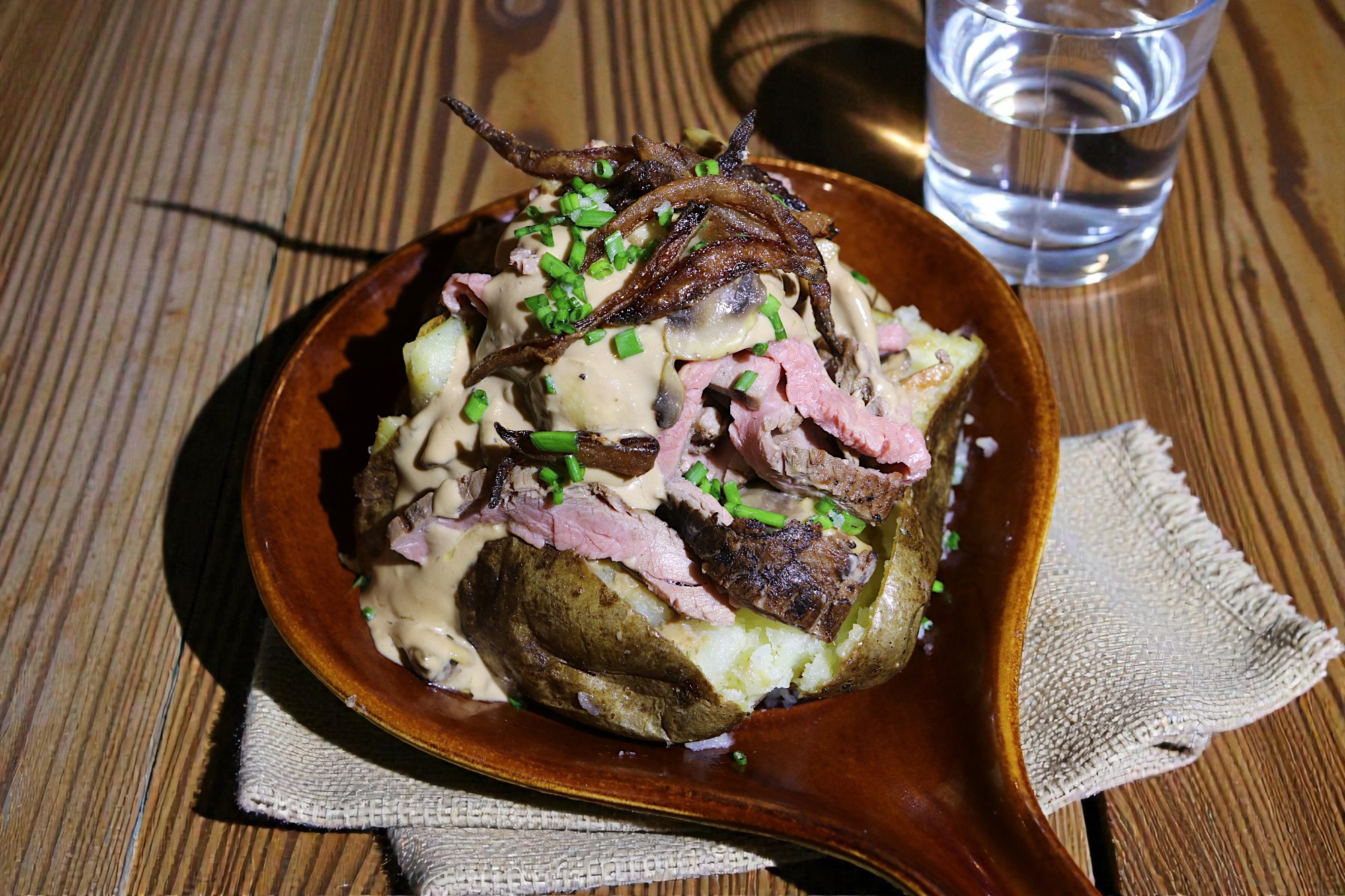 Baked potato topped with tender flank steak, house-made creamy mushroom sauce, crispy onions and fresh chives.