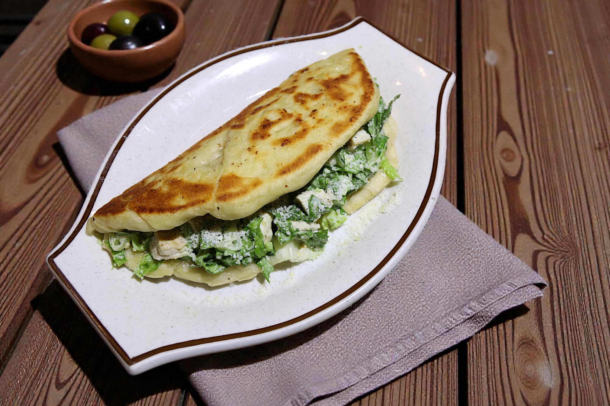 Chicken, romaine, parmesan, Caesar in a flat-top grilled pizza dough.