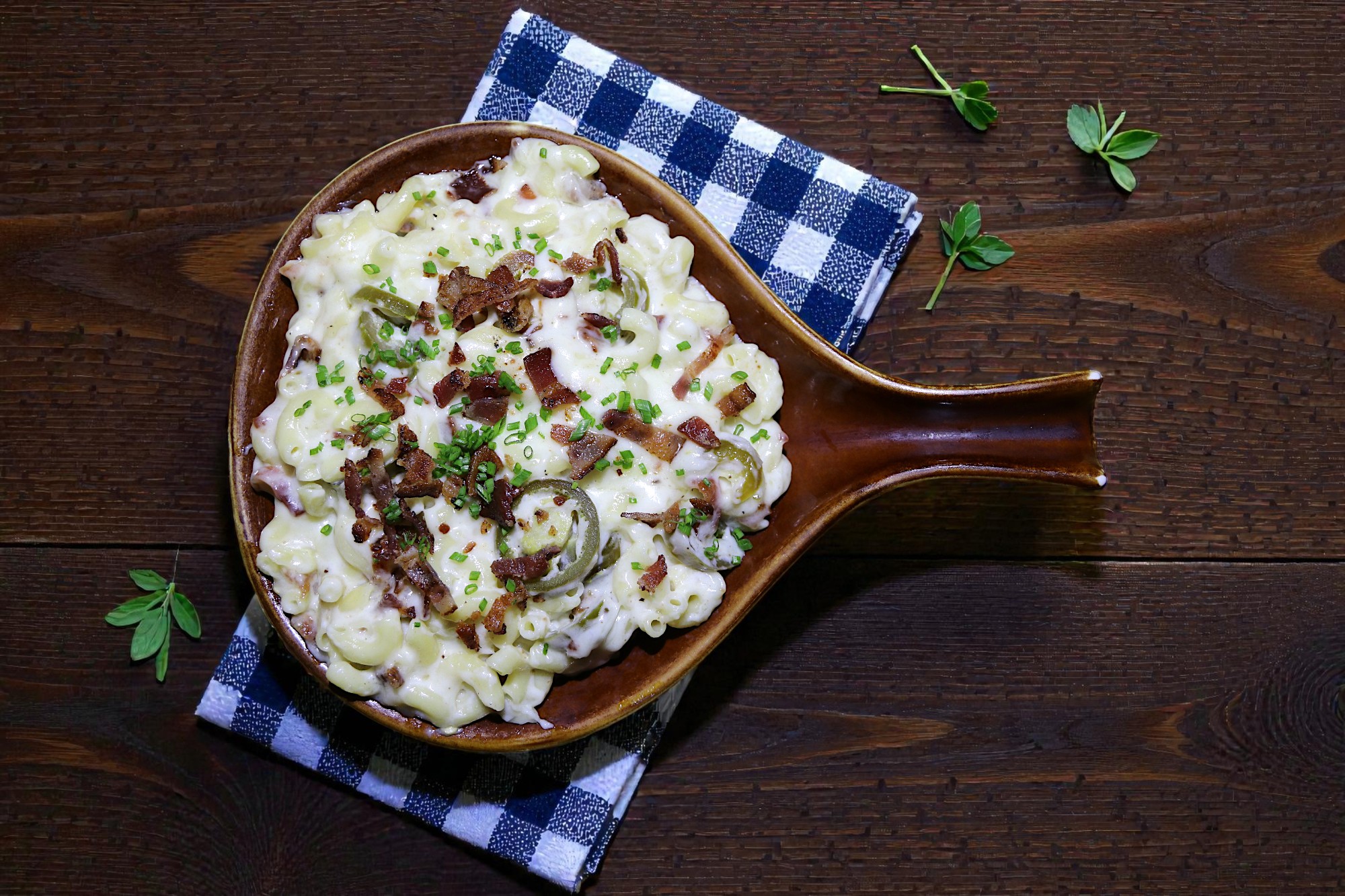 Elbow mac w/ bacon, jalapeño, white sharp cheddar & peperjack