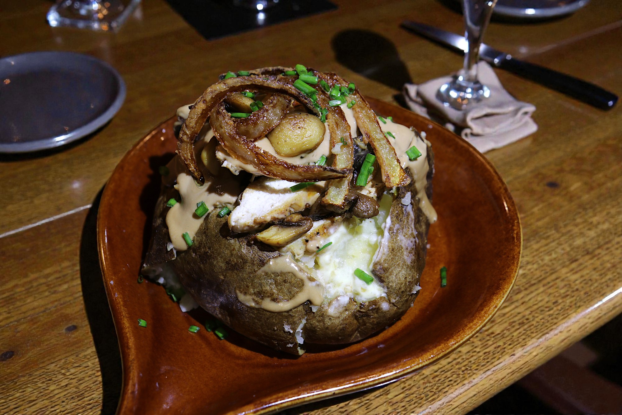 Baked potato with seasoned chicken, house-made creamy mushroom sauce, crispy onions and fresh chives.