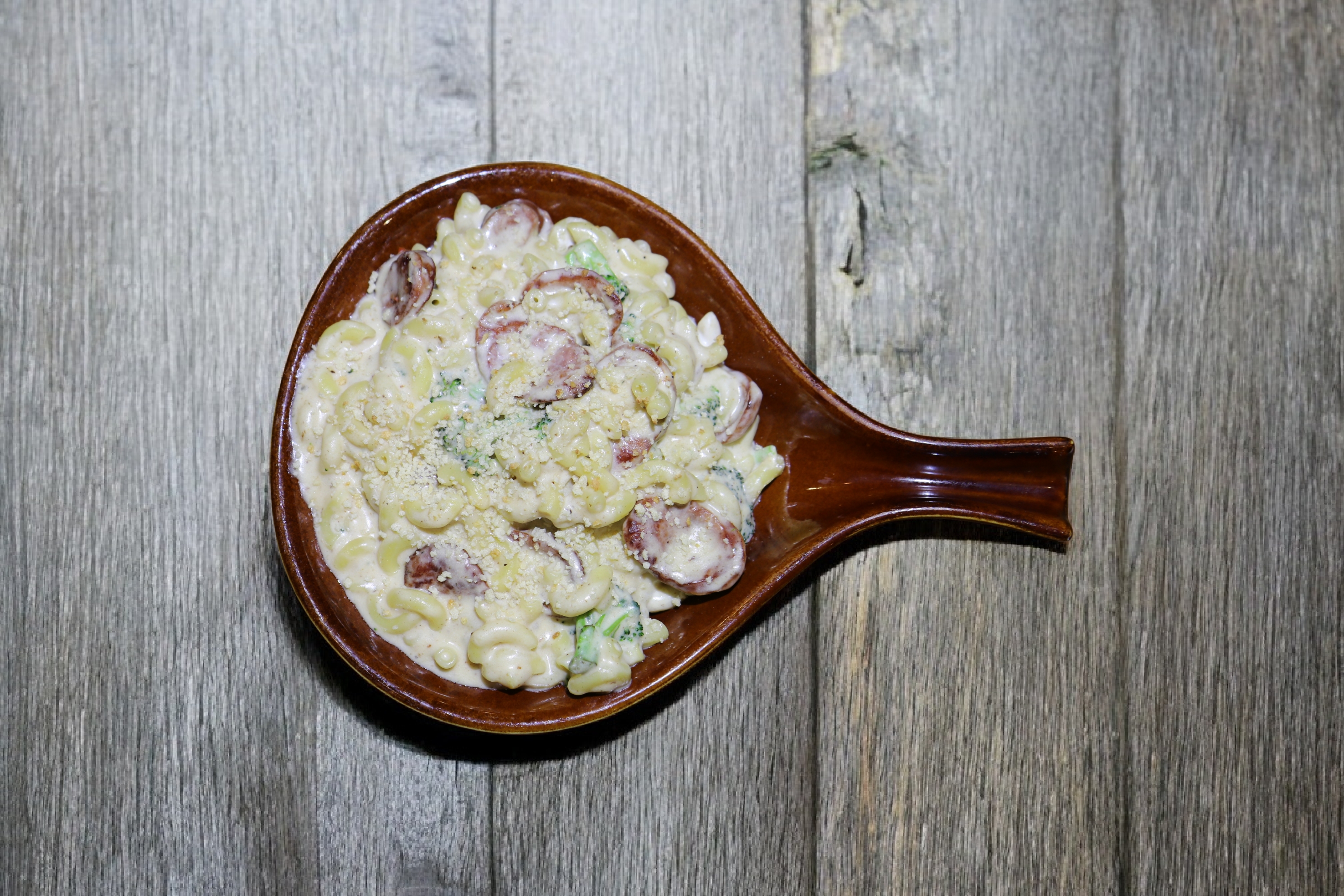 Cavatappi, yellow sharp cheddar, andouille sausage, broccoli