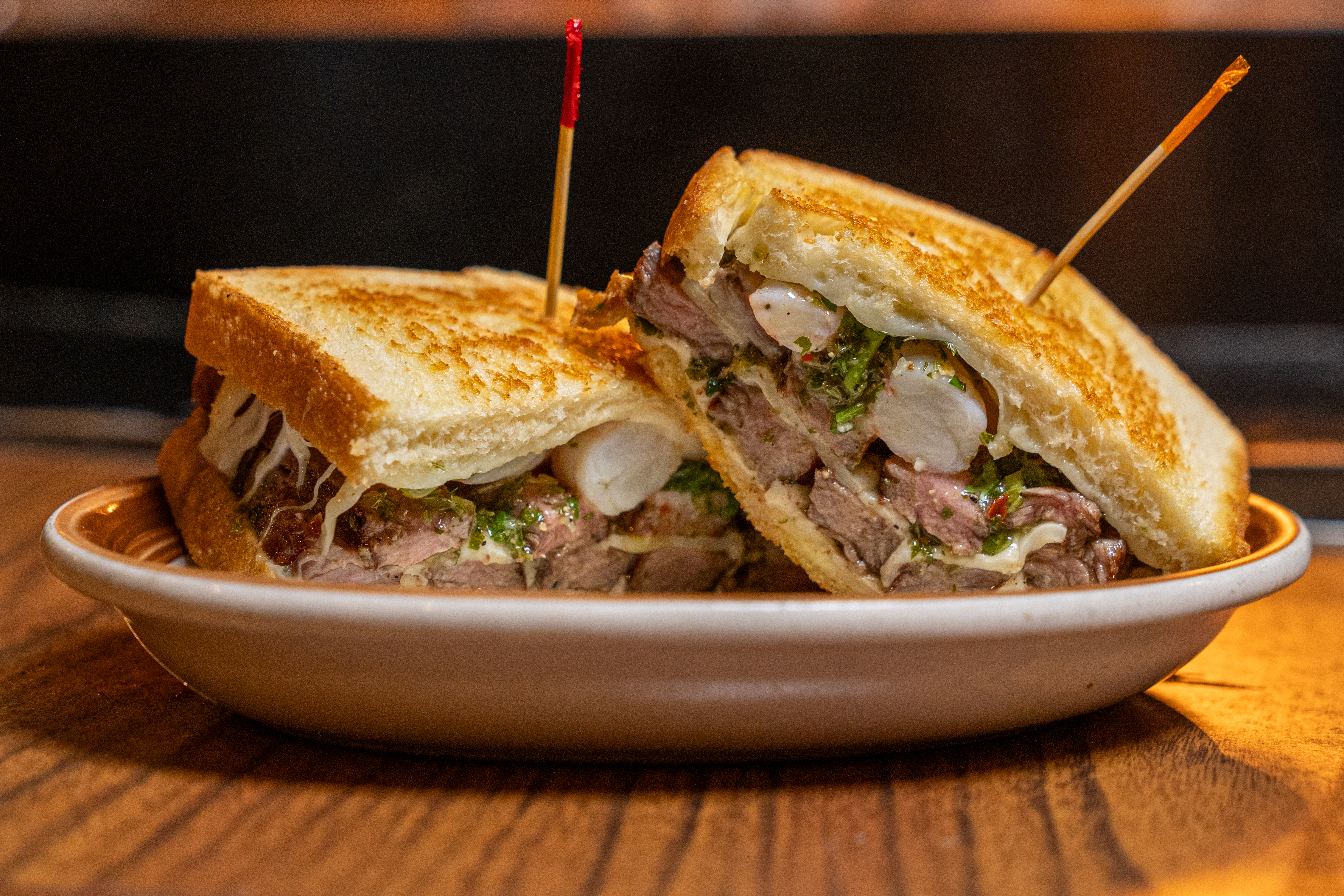 Steak, shrimp, chimichurri, mozzarella on grilled sourdough.